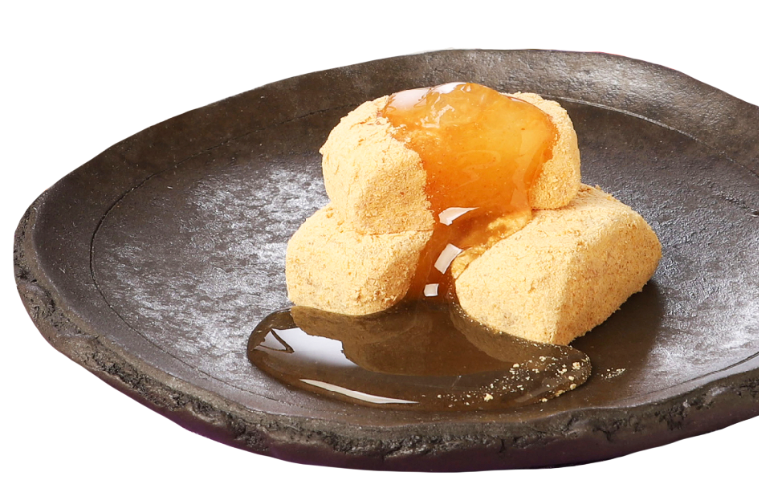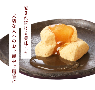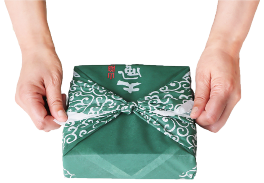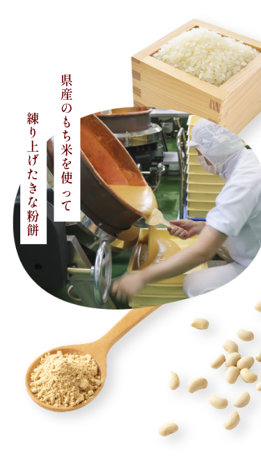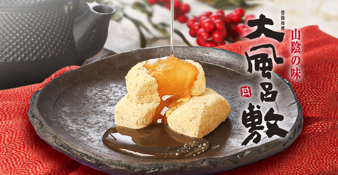 県産のもち米を使って練り上げたきな粉餅は、絶妙な柔らかさを出すために蒸す温度には注意を払い、甘みを引き立てる隠し味として地元の味噌を練り込んでおります。鳥取特産の二十世紀梨を使用した特製の「梨みつ」はフルーティーで、きな粉餅の香りや甘みを引き立てます。 緑の唐草模様が印象的な「大風呂敷」は、縁起の良さと素朴な美味しさで、愛され続ける秘訣がつまった逸品です。